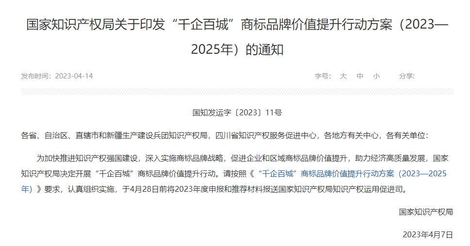 “千企百城”商标品牌价值提升行动方案(2023-2025)(来源:国家知识产权局)