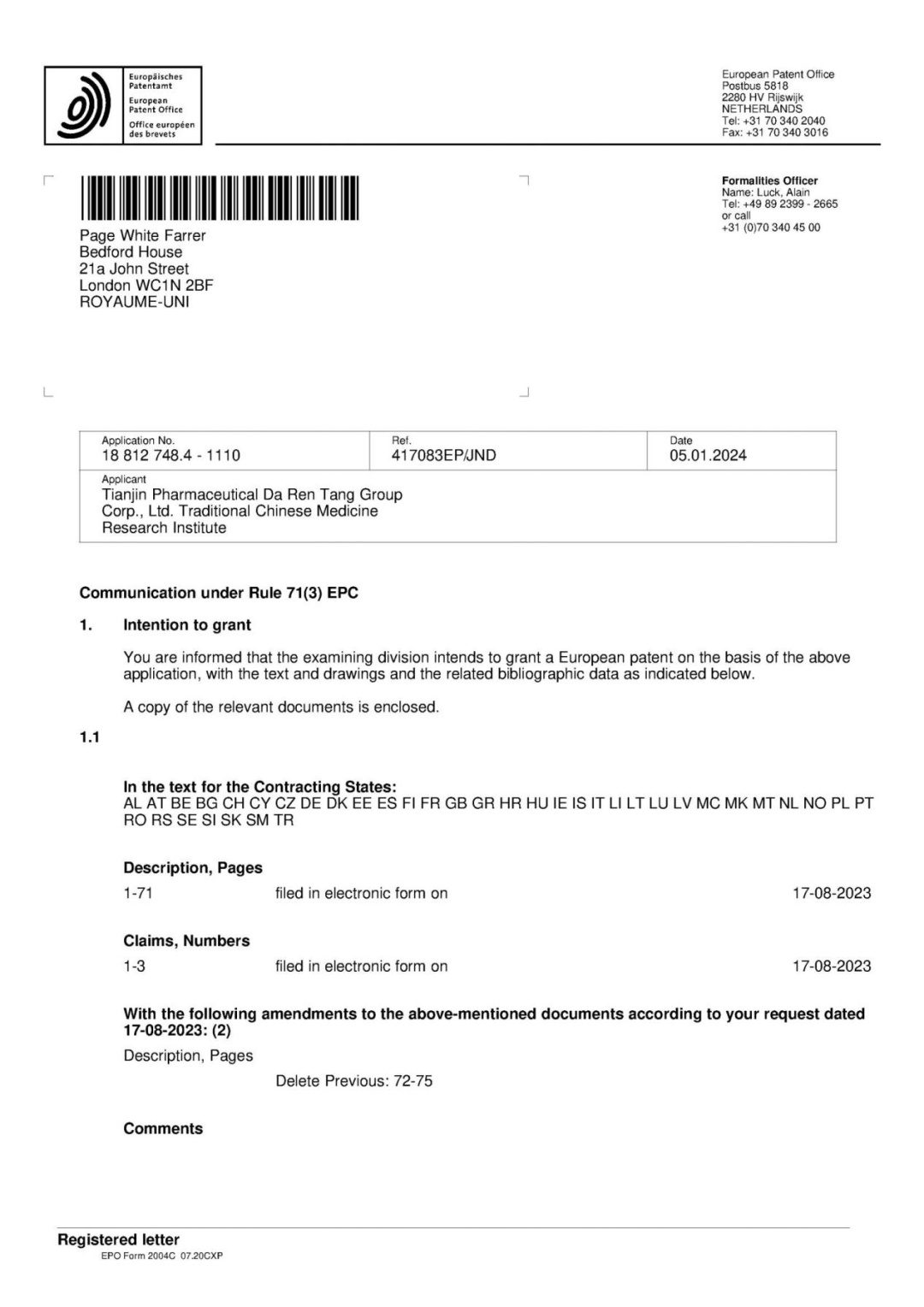 2024年新年伊始,知识产权国际布局传来喜讯。津药达仁堂中药研究院申报的“13-OXIDIZED INGENOL DERIVATIVE AND USE THEREOF”(13-氧化巨大戟二萜醇衍生物及其用途)获得欧洲发明专利授权,成为继中国、美国、澳大利亚之后获得授权的第4个重点地区。