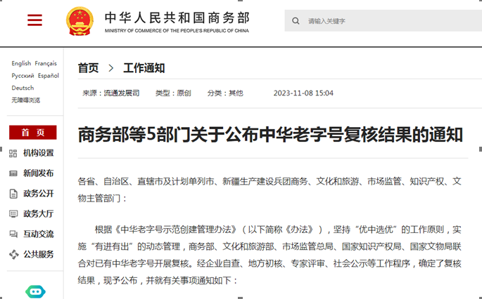 On November 8th, the Ministry of Commerce and other four departments issued a notice on publishing the results of the review of Chinese time-honored brands, confirmed the review results through a series of working procedures such as enterprise self-inspection, local review, expert review, and social publicity and published the results in the notice.