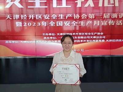 金耀药业文化大使冯珺儒在开发区安全生产协会举办的“安全在我心中”演讲比赛中,将企业文化理念完美融入到安全文化中,以“安全在心 敬佑生命”为题,从“心、手、口”三方面道来,展现公司特有的安全文化,并获得三等奖,积极践行着文化大使的光荣使命。